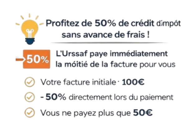 Le saviez-vous ? Grâce au dispositif de l'Urssaf, vous n'avez plus besoin d'avancer les 50% de crédit d'impôt pour les récupérer l'année suivante. La réduction est appliquée en temps réel sur votre facture.